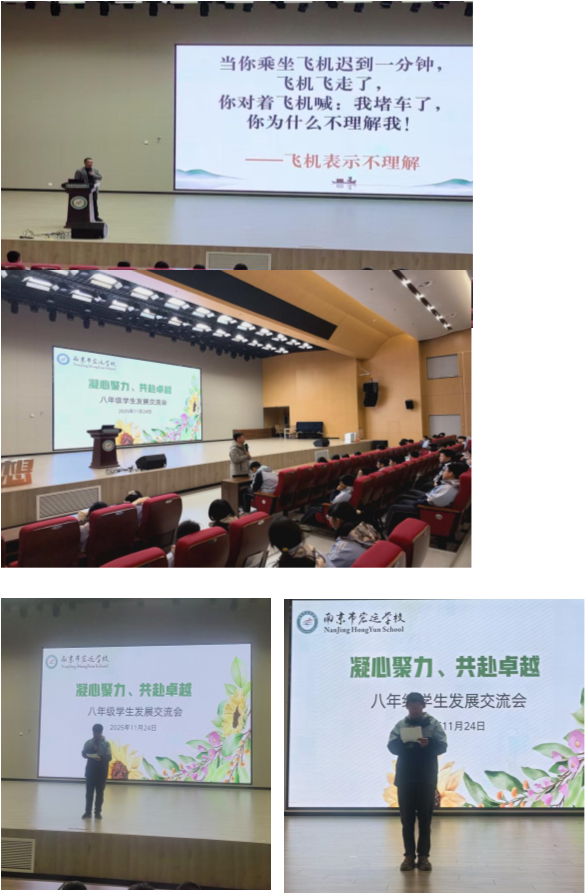 与此同时,八年级学生在报告厅同步召开期中总结会议。优秀学生代表分享学习方法与心得,传递高效学习技巧;进步学生代表讲述成长历程与突破,展现坚持不懈的奋斗精神。随后,分管领导周副校长以专题讲座形式,围绕目标规划、心态调整、责任担当等内容,为学生注入成长动力,引导大家明确方向、奋勇争先。最后,年级组戴老师作总结发言,肯定学生半学期的努力,鼓励全体同学以期中为新起点,查漏补缺、砥砺前行。